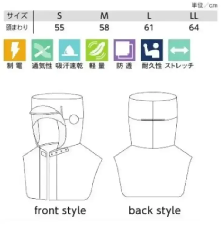 ■形状特長前開き仕様・頭部保護具対応(Sサイズを除く)・美額フライス・後頭部ゴム・長髪対応設計・メガネホルダー・マスクホルダー・首元スナップボタン
