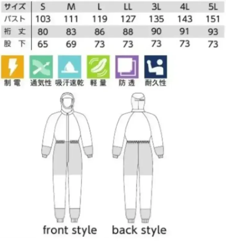 ■形状特長フード一体型(頭部保護具収納可能)・上下一体型・後頭部スナップボタン・顔まわりフライス・顔まわりスナップボタン・首元ケープ構造・ウエスト調整ゴム・袖口二重Wフライス・裾口二重Wフライス・メガネホルダー・マスクホルダー