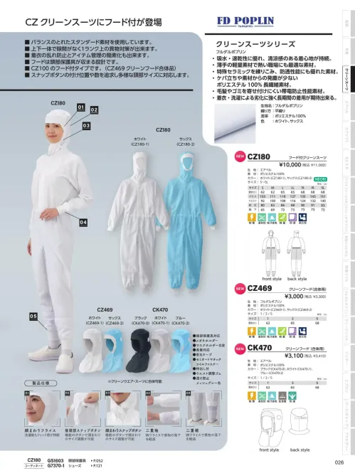 クリーンスーツとの組み合わせで異物対策を強化できるFD POPLIN クリーンスーツシリーズ対応のクリーンフードCZ469です。吸水性・速乾性に優れたフルダルポプリン素材を使用し、清涼感のある着用感を実現。薄手で軽量ながら防透性と低発塵性を備え、クリーン環境に求められる快適性と管理性を両立します。