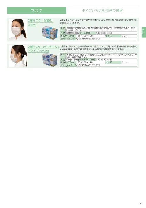 呼吸がしやすく蒸れにくい2層タイプの不織布マスクです。ポリプロピレン不織布と軽量素材を組み合わせ、食品工場や厨房などの暑い環境でも快適に使用できます。柔らかな耳ひもで長時間の着用も負担が少なく、日常から業務まで幅広く活躍します。