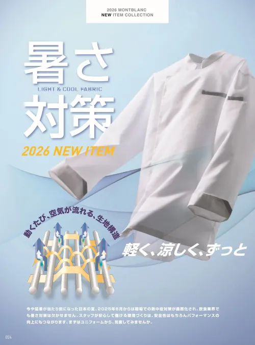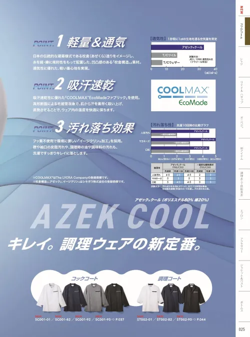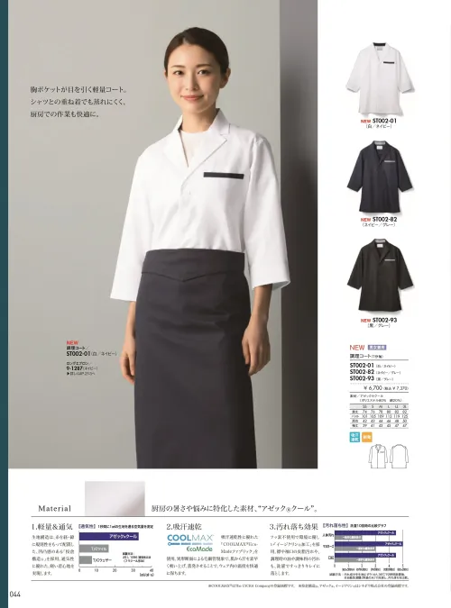 胸ポケットが目を引く軽量コート。厨房の暑さや悩みに特化したアゼック®クール素材を採用し吸汗速乾性と防汚性を両立。シャツとの重ね着でも蒸れにくく、厨房作業の快適を支えます。