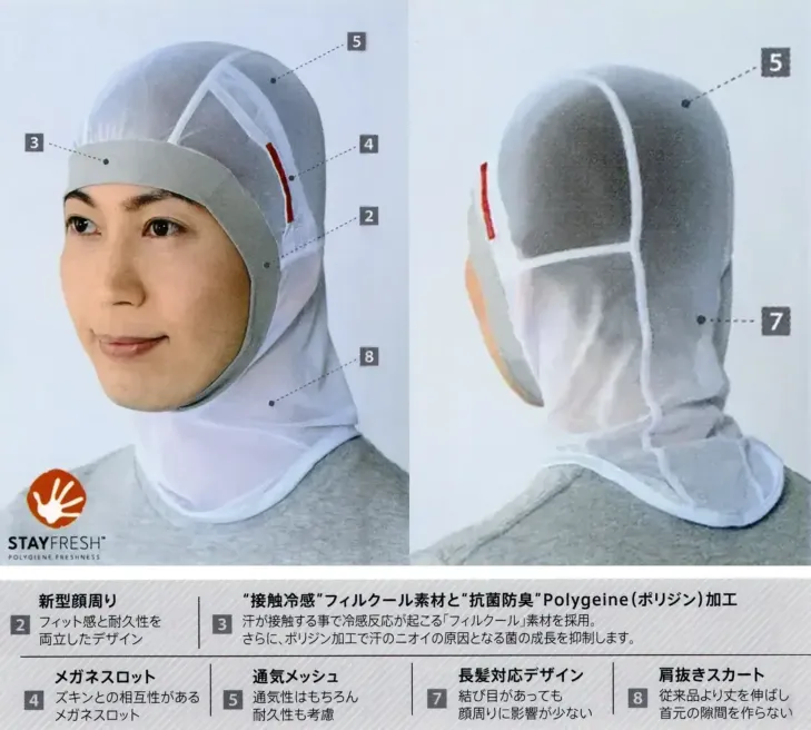 フルフェイス(クール)インナーキャップは、接触冷感素材「フィルクール」と通気性に優れたメッシュ構造を組み合わせた軽量タイプです。汗に触れると冷感反応が起こる素材が暑い現場でも快適さを持続させ、顔周りの新デザインが密閉性とフィット性を向上。抗菌防臭加工「Polygiene(ポリジン)」が清潔さをキープし、メガネスロットや肩抜きスカートによる毛髪対策性能も強化されています。