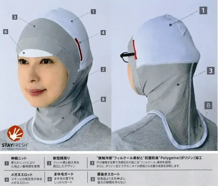 フルフェイス(クール)まゆ毛ガードインナーは、接触冷感素材「フィルクール」と新型顔周り構造による高い密閉性で、暑い現場でも快適に毛髪対策が行える高機能モデルです。まゆ毛落下を防ぐガード構造を備え、異物混入リスクを大幅に低減。伸縮ニットによる柔らかなフィット感と、フィルクール生地部分に付与された抗菌防臭加工「ポリジン」が長時間の作業でも清潔さをキープします。メガネスロットや肩抜きスカートなど、ズキン併用を想定した設計が快適性と作業効率を高めます。