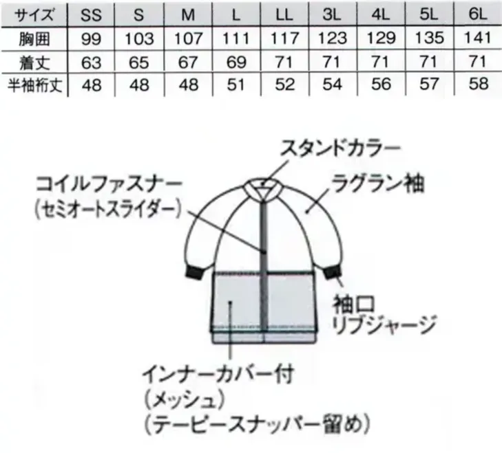 ■形状特長巻縫い、スタンドカラー、ラグラン袖、コイルファスナー(セミオートスライダー)、袖口リブジャージ、インナーカバー付(メッシュ)(テーピングスナッパー留め)