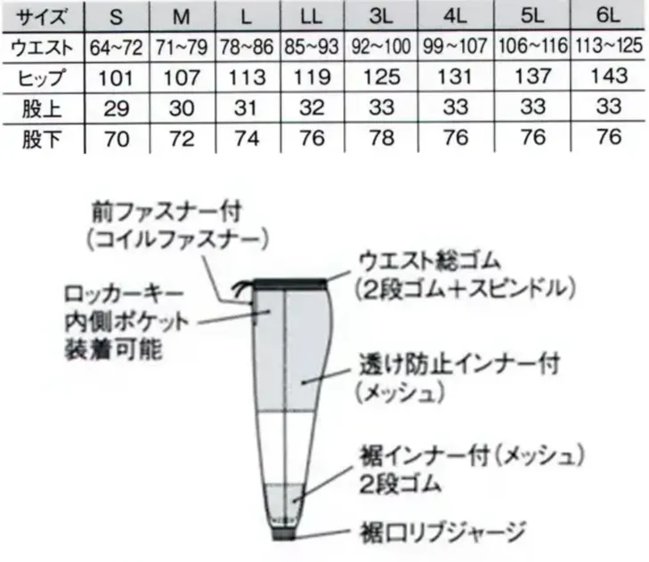 ■形状特長巻縫い、パイピング、前ファスナー付(コイルファスナー)、ロッカーキー内側ポケット装着可能、ウエスト総ゴム(2段ゴム+スピンドル)、透け防止インナー付(メッシュ)、裾インナー付(メッシュ)2段ゴム、裾口リブジャージ