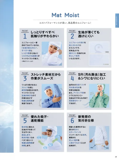 ■素材特長吸汗速乾、肌触りがいい、制電、ストレッチ、優れたSR性(防汚)、透けにくい