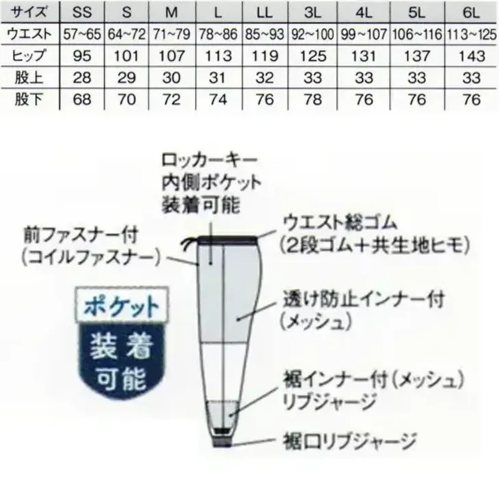 ■形状特長ロッカーキー内側ポケット装着可能・ウエスト総ゴム(2段ゴム+共生地ヒモ)・透け防止インナー(メッシュ)・裾インナー(メッシュ)・裾口リブジャージ・前コイルファスナー