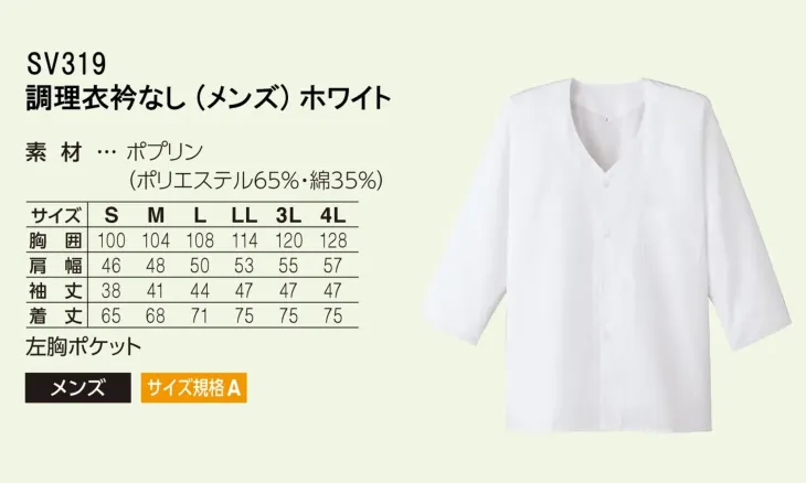 調理衣衿無し(メンズ) サーヴォSV319のサイズ表