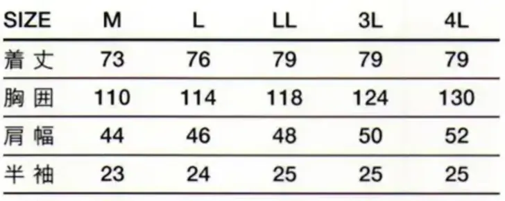 男子衿なし調理服 半袖 傳馬屋3212のサイズ表