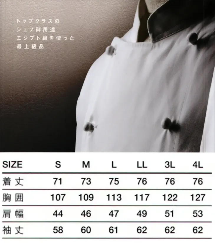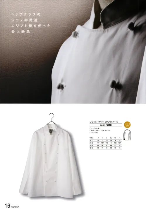 トップクラスのシェフ御用達、最高級のエジプト綿を使用したシェフジャケット(オフホワイト)3810。しなやかで上質な光沢を放つエジプト綿100%の生地が、着る人の品格を高めます。長時間の厨房作業にも快適な肌触りと通気性を兼ね備え、プロフェッショナルな現場での使用にふさわしい逸品です。