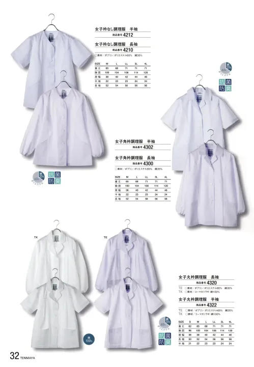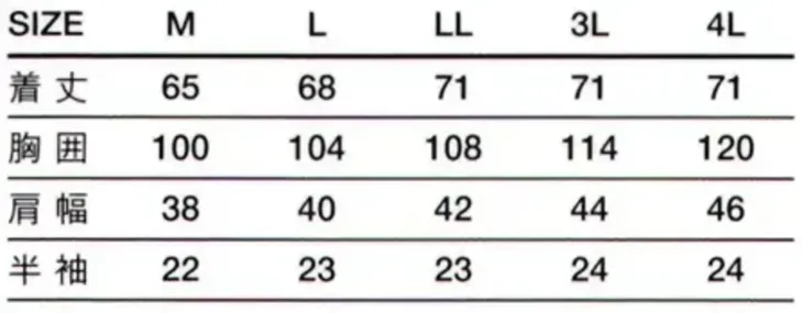 女子衿なし調理服 半袖 傳馬屋4212のサイズ表