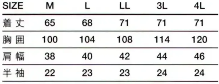 女子角衿調理服 半袖 傳馬屋4302のサイズ表