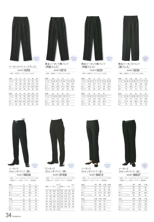 男女ツータック黒パンツ(両脇ゴム入) 傳馬屋9220のサイズ表