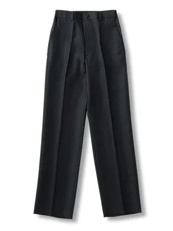 動きやすさと清潔感を両立した男女ツータック黒パンツ(両脇ゴム入り)9220。 ゆとりのあるツータック仕様で動きやすく、両脇ゴム入りでウエストまわりのフィット感を高めています。 素材には制電ギャバを使用しており、静電気の発生を抑える制電性と汚れが付きにくく落ちやすい防汚性を兼ね備えています。 厨房・サービス・食品関連の現場など、常に清潔さが求められる環境に最適です。