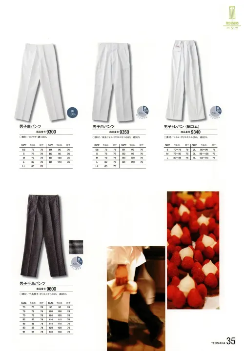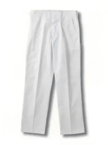 清潔感あふれる定番スタイルの男子白パンツ 9300。丈夫なカツラギ素材(綿100%)を使用。しっかりとした生地厚でシルエットを美しく保ちながらも、動きやすく、厨房・製菓・食品加工などの現場に最適。