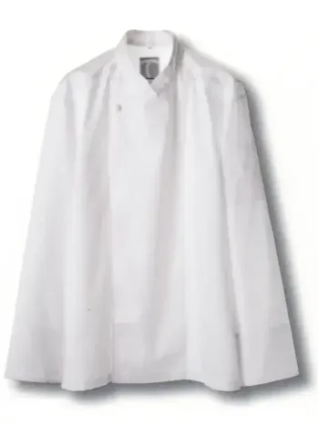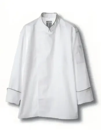 襟元と袖口にあしらわれたブラックパイピングが上品なアクセントとなるコックコート。ポリエステル65%・綿35%のツイル素材を使用し、耐久性と快適な着心地を両立。抗菌防臭加工により常に清潔感を保ち、厨房やレストランでの長時間作業にも最適です。シンプルながらも高級感のあるデザインで、プロフェッショナルな印象を演出します。