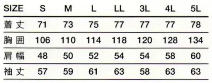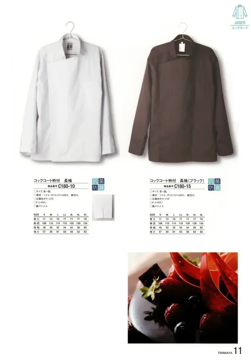 コックコート衿付 長袖 傳馬屋C180-10のサイズ表
