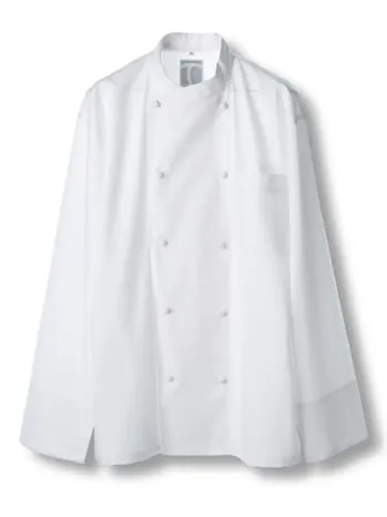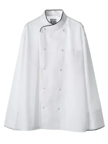 襟元と前立てにあしらわれたグレーパイピングが引き締まった印象を与えるコックコート。ポリエステル65%・綿35%のツイル素材を採用し、シワになりにくく耐久性も抜群。抗菌防臭加工が施され、厨房での清潔感と快適さを長時間キープします。洗練されたデザインで、プロの現場にふさわしい一着です。