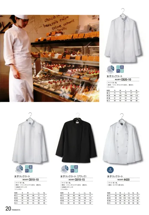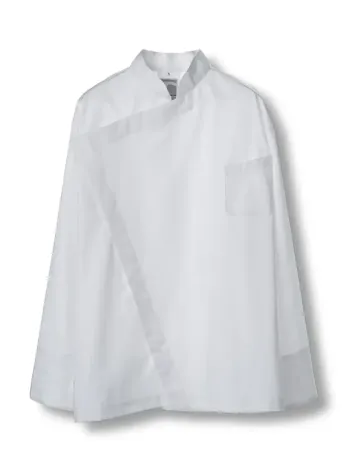 清潔感と機能性を兼ね備えた女子コックコート。女性のシルエットに合わせた設計で、動きやすく美しいラインをキープします。ポリエステル65%・綿35%のツイル素材を使用し、シワになりにくく、抗菌防臭加工でいつでも清潔に着用可能。レストランやパティスリー、ホテル厨房など幅広い現場で活躍します。