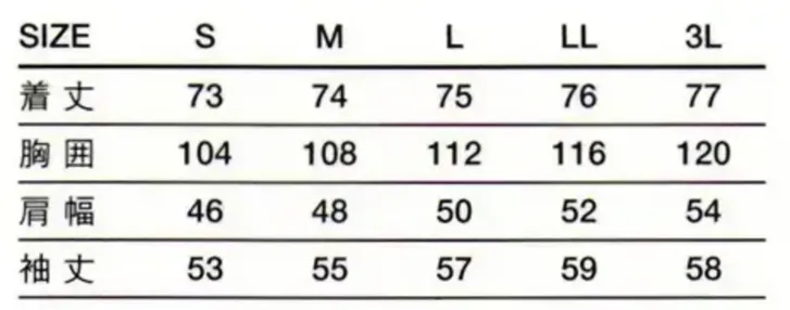 コックコート 長袖(ブラック) 傳馬屋C730-15のサイズ表