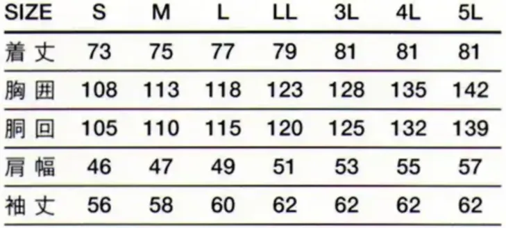 シェフジャケット 長袖(オフホワイト)受注生産 傳馬屋C810-10のサイズ表