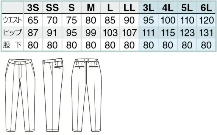 ストレッチパンツ(ノータック)(男女兼用) アイトスAZ-50506のサイズ表