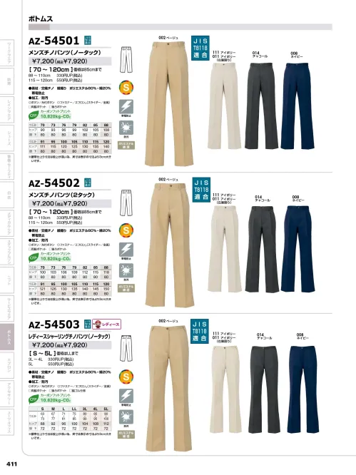 レディースチノパンツ アイトスAZ-54503のサイズ表