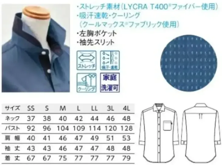 ■素材特長吸汗速乾・ストレッチ(LYCRA T400®ファイバー使用)・クーリング(クールマックス®ファブリック使用)・家庭洗濯可
