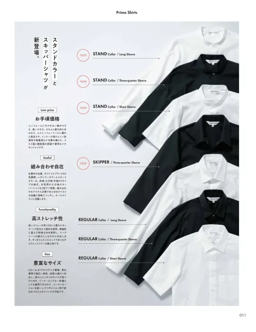 首元をすっきりと見せるスタンドカラーが印象的な長袖シャツ。Primeflex®使用ストレッチブロード素材を採用し、ポリエステル75%・綿25%。動きやすさと清潔感を兼ね備え、接客・サービス・オフィスユニフォームまで幅広く活躍します。