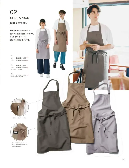 汚れに強く、快適な着用感を追求した27346シリーズの胸当てエプロンです。トロピカル素材のポリエステル100%生地に、油汚れを落としやすいダントツオイル加工を施し、軽量で負担の少ない着心地を実現。やわらかく落ち着いたモカカラーが、飲食店やサービス現場に上品で洗練された印象を与えます。