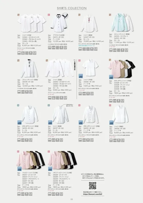 ストレッチシャツ(男女兼用) ボストン54335のサイズ表