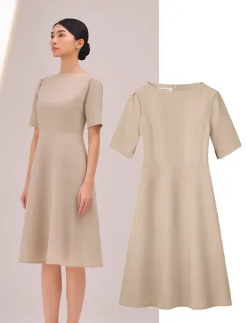 ■形状特長サブリナネック 肩タック ウエストシェイプ フレアシルエット センターファスナー ソフトタック 両腰ポケット