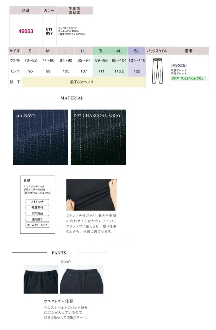 快適な履き心地とスマートなシルエットを両立させたメンズパンツ。ストレッチ性に優れた素材で動きやすく、接客や営業など幅広いシーンで活躍します。ウエスト両脇にゴムを入れた仕様で、長時間の着用もストレスフリーです。