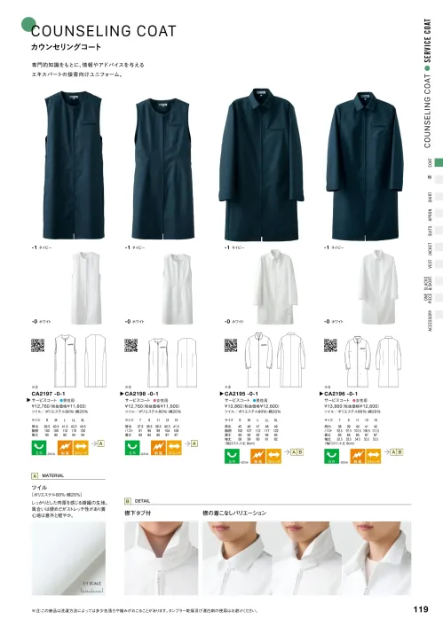 サービスコート(男性用) セブン(白洋社)CA2195のサイズ表