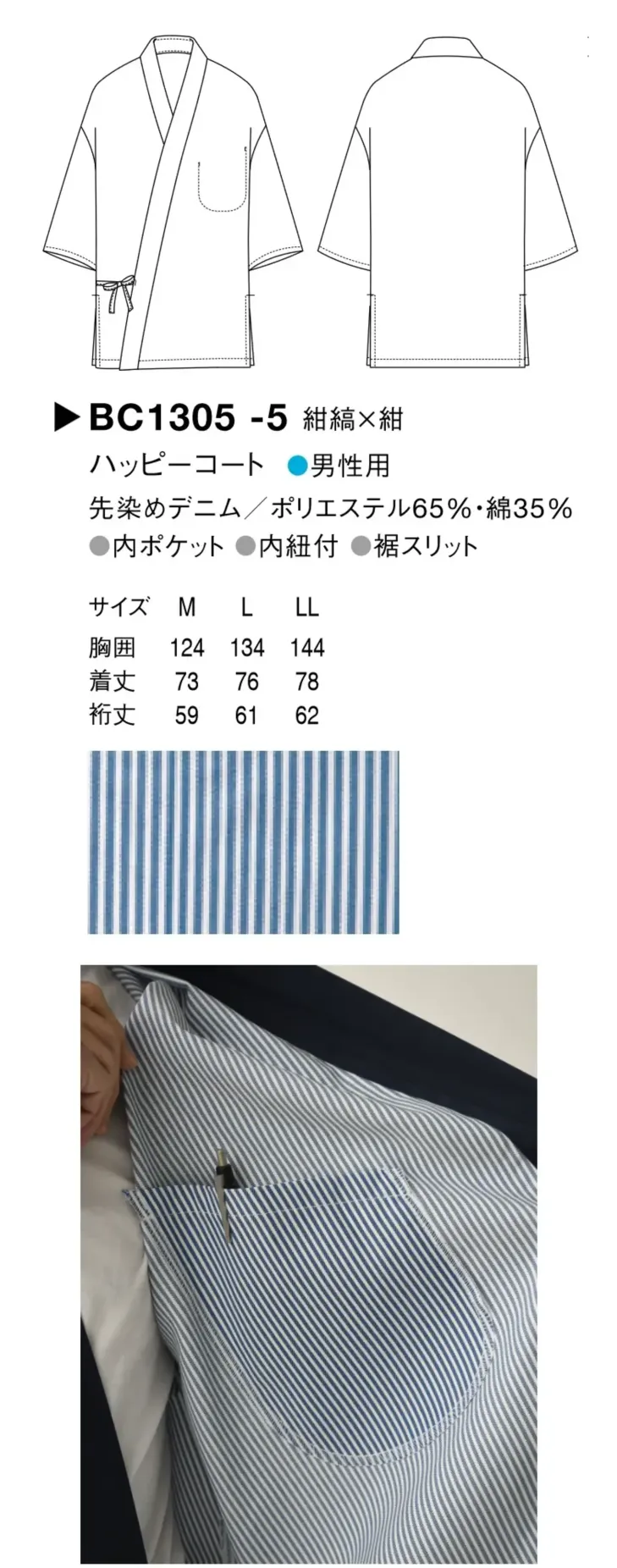 ポリエステルと綿のしっかり厚みのある先染めストライプデニム生地で作られた法被(ハッピーコート)です。襟は別布のネイビー配色を施し、締まった印象を与えます。色、柄がありますのでカジュアルさ、活気あるシーンなどにオススメです。内側を紐で結び、外側でも紐を結んで着用する仕様です。左胸内側にポケットあり。袖は5部丈。