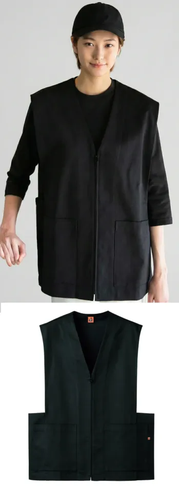 前後生地が違うオーバーサイズベストです。前は布のツイル撥水生地、後ろジャージー天竺生地。ホスピタリティーを保ちながら動き易いアイテムです。Tシャツ、シャツなどの上にこのベストを羽織ることでおもてなしスタイルが成立します。前はファスナー、腰に大きなポケットありユニフォームらしいディティールです。