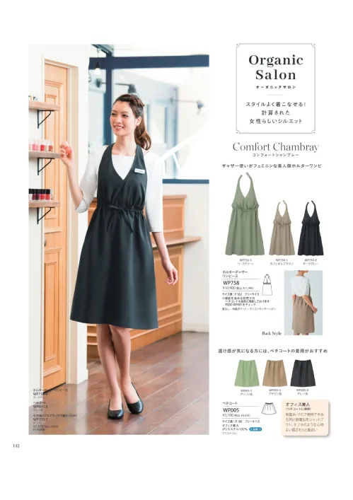トレンド感のあるホルターネックとふんわりスカートで、女性らしい美しいシルエット。首の後ろのフラワーモチーフのボタンが、キュートなアクセント。ボタン位置を変えれば、長さ調整ができます。視線を上に引きつける、ややハイウエストのデザイン。ギャザーを均等に寄せるのが、キレイに着こなすポイント。両脇にシームポケット付き。 ざっくりとしたコットンシャンブレーのような感触で、見た目にもさわやかな素材。洗濯機OKで乾きやすい。たたんでもシワになりにくく、適度なストレッチ性があり着心地は軽やかで快適です。 着こなし自在、新感覚のユニフォーム。ナチュラルな優しさあふれるウエアは、着心地がラクで動きやすさも抜群。コーディネートの自由さも魅力。ヘアサロン、雑貨ショップ、スパ、幼稚園・保育園、カフェ、カジュアルレストランなどに。