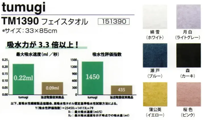 最大吸水速度0.22ml毎秒、吸水性評価指数1450という高い性能で、一般基準品の約3.3倍以上の吸水力を誇る高品質フェイスタオルです。33×85cmの標準サイズながら、ふんわり軽い風合いとすばやい吸水性で、毎日の洗顔後やお風呂上がりにすぐ馴染む快適な使い心地を実現します。