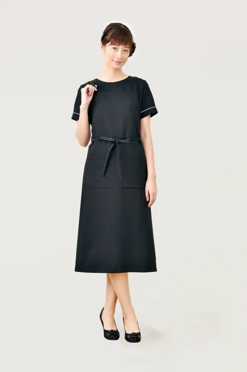 すっきりとしたシルエットの機能的エプロン。おしりをすっぽり包み込むデザインなので、バックスタイルを気にすることなく快適です。ウエストリボンの裏面にはお洒落なテープがついています。