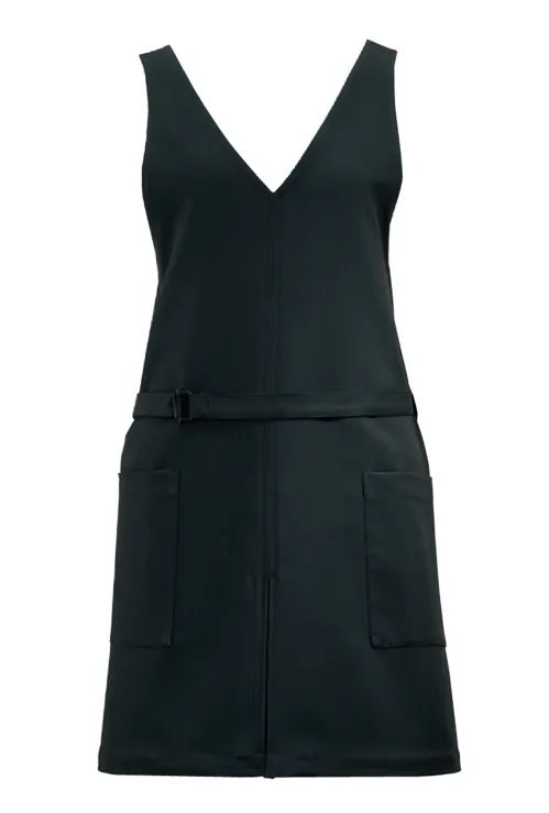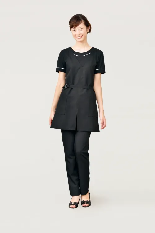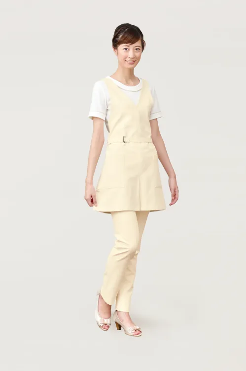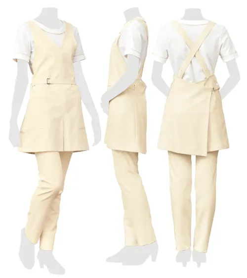 ■形状特長両脇ポケット付。 前スリット入り。 肩ひもボタン調節(ボタンホール3ヶ所)。 ウエストベルトバックル付。