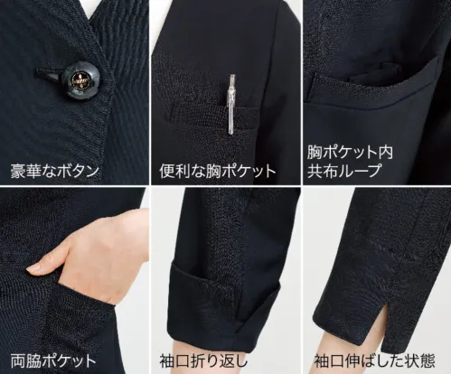 ■形状特長左胸・両脇ポケット、裏無し、胸ポケット内側共布ループ付、袖口スリット入り(折り返し可能)