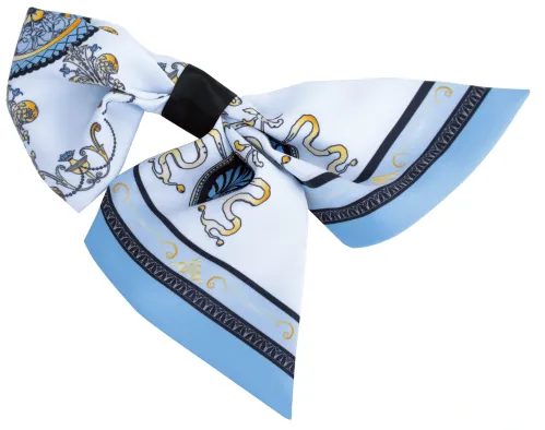 着こなしのポイントになる華やかなリボンスカーフ。これ一つプラスするだけでワンランク上の装いに。クリップ&ブローチピンの二重構造のため、場所を選ばず簡単に装着が可能です。