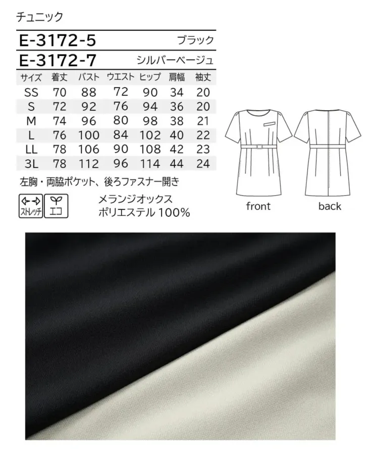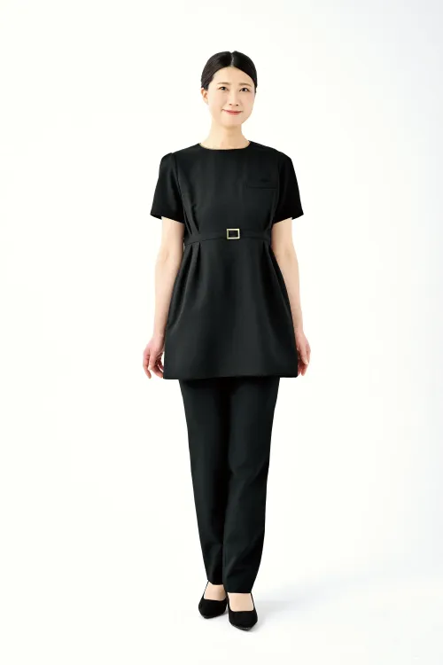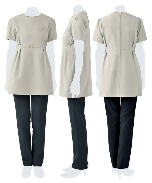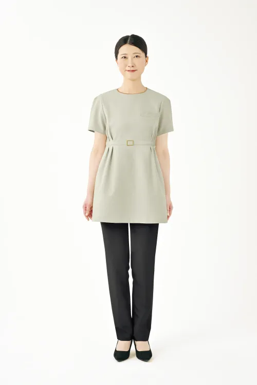 上品なシルエットと全身バランスがすっきり見える絶品チュニックです。パンツを合わせた時に絶妙なシルエットになるように追求した黄金バランスです。パイピングやバックルのゴールドを効かせたエレガントなデザイン。受付やサロン、医療・サービス現場まで幅広く対応できる一着です。