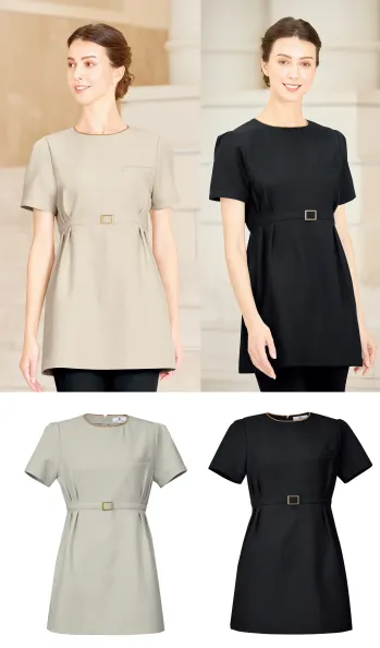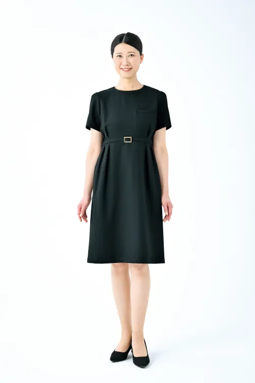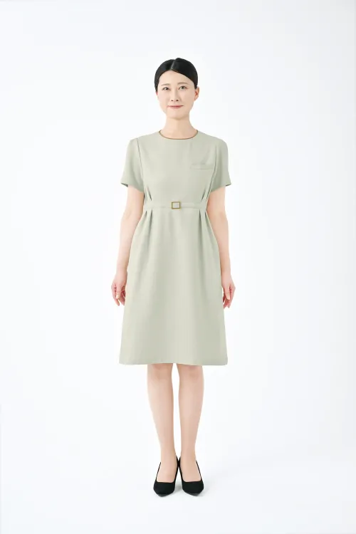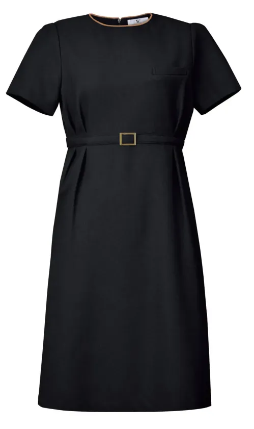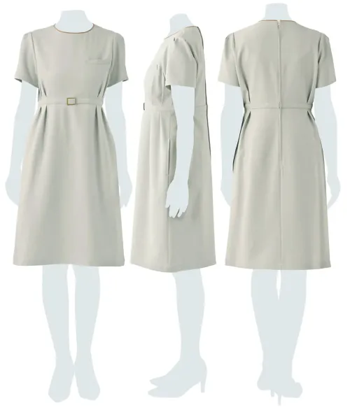 上品な佇まいと着心地の良さを兼ね備えたレディースワンピースです。襟もとのパイピングとウエストのゴールドのバックルが華やか度をUPさせています。上質でツイーディーな風合いの素材を使用しているため、好印象なイメージです。シンプルながら洗練されたシルエットで、受付・インフォメーション・接客シーンなど幅広い業務に対応します。