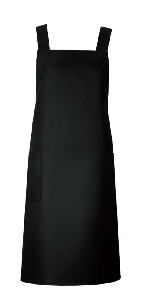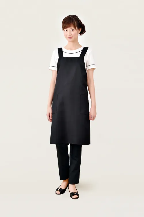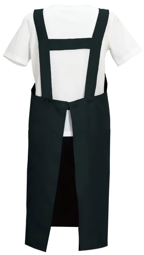 使いやすい定番エプロン。撥水・撥油・制電加工のハリのある素材を使用したエプロン。肩ヒモ、ウエストはボタンでサイズ調節可能。両脇ポケット付き。
