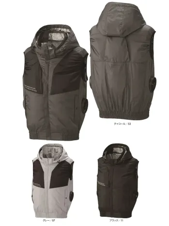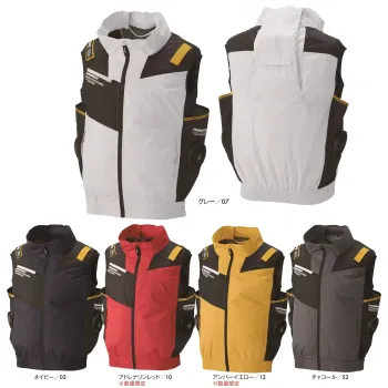 ■形状特長ベスト|サイドファン|脇通気路CIRCULATE V|首筋立体風気路|反射プリント|フックハンガー取付ベルト|右胸ポケット|両脇ポケット|バッテリーケーブルコードホール|保冷剤ポケット|背中フルハーネスランヤード取付口