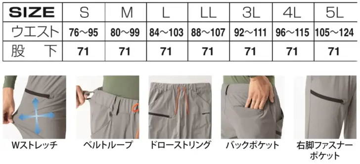 ■形状特長ジョガーパンツ|ウエストドローストリング|ベルトループ|バックポケット|右脚ファスナーポケット