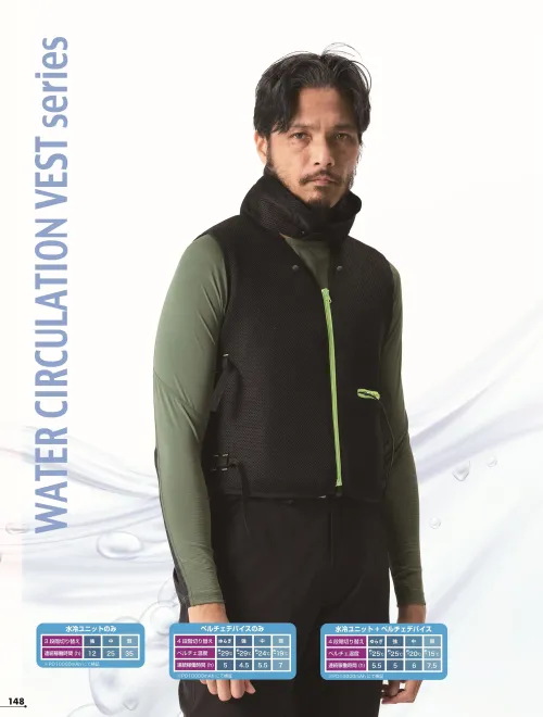 ダントツの冷却効果を誇る水冷循環ベストがドデカサイズのペルチェデバイスと融合して登場!氷で冷やした冷水がベストの前面、背面を隅々まで循環し、上背部では業界最大級の超ドデカペルチェの瞬冷パワーが内部から身体を冷却。