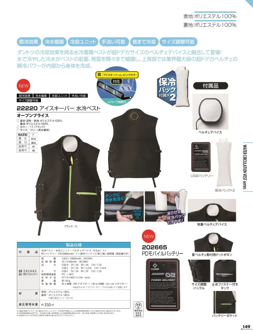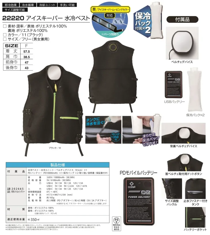 ・セット内容:水冷ベスト本体・水冷ユニット・ペルチェデバイス(9.5cm)・PDバッテリー(PD10000mAh)・保冷パック×2・取扱説明書(保証書付)