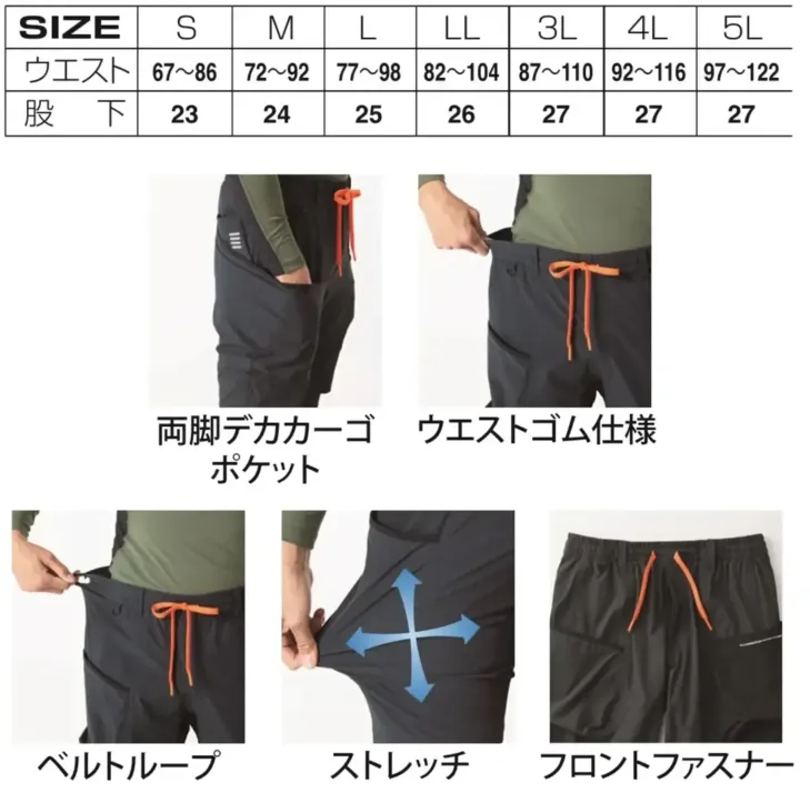 ■形状特長カーゴハーフパンツ|ひざ上丈|両サイドデカカーゴポケット|6ポケット仕様|ウエストゴム仕様|ベルトループ|フロントファスナー